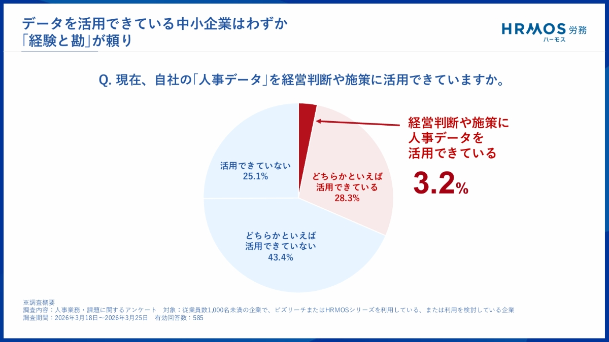 それにもかかわらず、多くの中小企業では、入社後に採用選考時の情報が引き継がれていない。また、異動や配属は「経験と勘」が頼りになっているなどの実態が、アンケートで明らかになっている。酒井社長は「人材定着のカギは、横断的なデータ基盤とその活用にあります。それが『HRMOS労務』のポイントです」と語った。