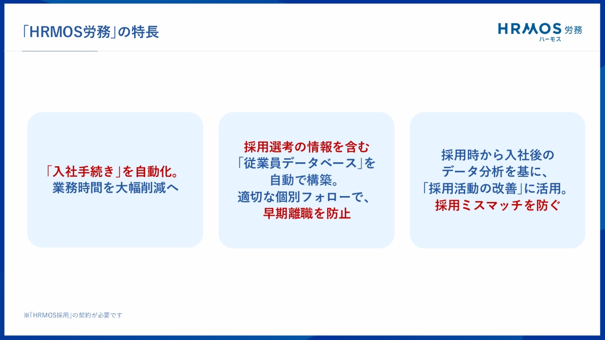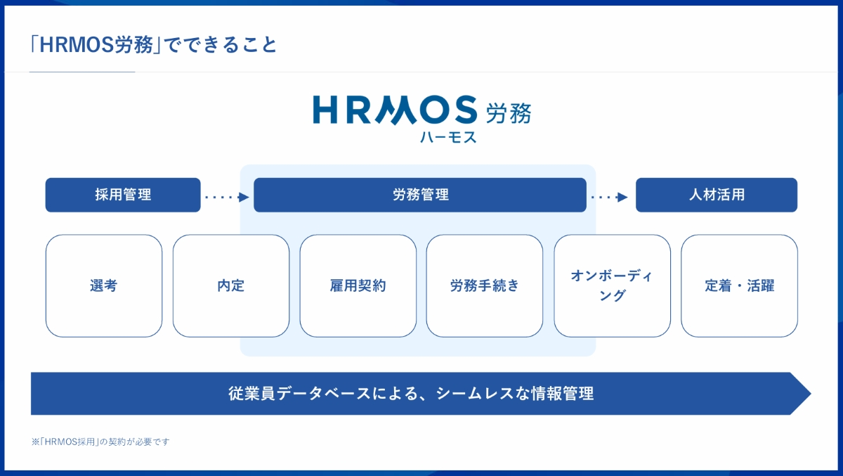 そこで「HRMOS労務」は、同シリーズの採用管理システム「HRMOS採用」との連携により、採用時の評価・職務経歴書などのデータが入社手続きを経てオンボーディング管理まで一気通貫でつながり、ボタン一つでシームレスに連携できる仕組みを提供する。