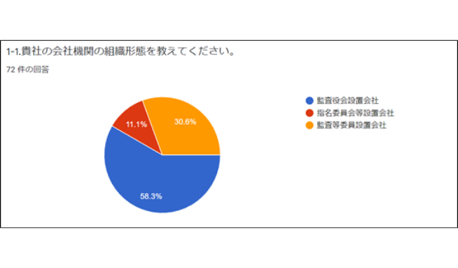 今回の調査で会社機関の組織形態を問う設問では、監査役会設置会社は58.3%、監査等委員会設置会社 30.6%、指名委員会等設置会社 11.1%という結果となった。コーポレートガバナンス・コードへの対応を受け、日本企業のガバナンス構造が変化していることが分かった。