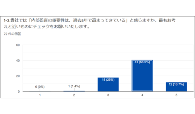 「貴社では『内部監査の重要性は、過去5年で高まってきている』と感じますか」との問いに、73.6%が「高まっている」「とても高まっている」と回答した。また、「貴社では『ガバナンス強化の重要性は、過去5年で高まっている』と感じますか」は87.5%が「高まっている」「とても高まっている」と回答している。