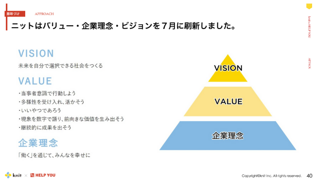 【「働く」を通じて、みんなを幸せに】は2021年に新しく定めたニットの企業理念である。ニットに関わる全ての人に「働く」ことを通じて人生をより豊かにしてほしい。そのような思いで事業を運営している。