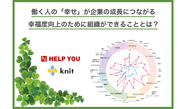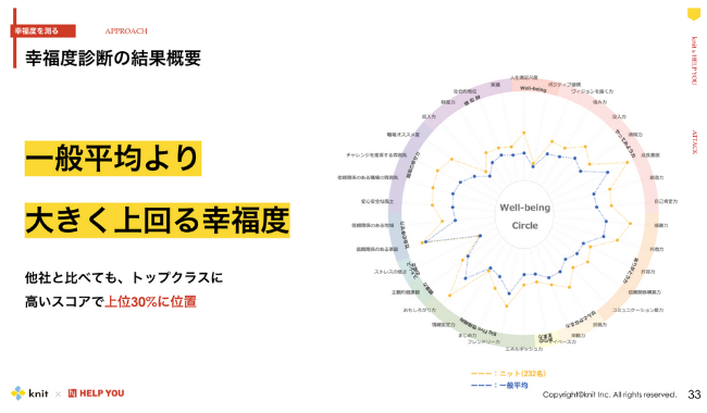 株式会社ニット(本社:東京都品川区、代表取締役社長:秋沢崇夫、以下ニット)は、2015年よりフルリモート前提で創業し、現在、約400人が日本全国・世界33カ国からオンラインで業務を遂行している。このたび、ニットおよびHELP YOUメンバーを対象に「幸福度診断(Well-Being-Circle)」を実施した。