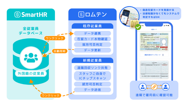 ロムテンは、スマートフォンのアプリや管理画面を使って外国籍従業員を雇用前に在留カード真贋判定と就労可否判定、雇用後に外国人特有の労務管理に対応したクラウド型プラットフォームである。今回のAPI連携※1によって下記の操作ができるようになった。