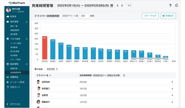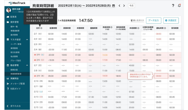 MeeTruckが提供するドライバーの拘束時間管理機能では、Webアプリ上に各ドライバーの始業時刻、終業時刻、休憩時間等を入力することにより、国が定める基準に適合した仕事の割り振りをしているか、視覚的に容易に把握することができる。
