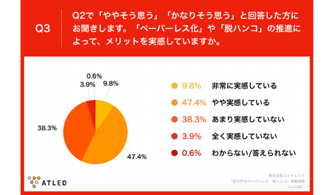 Q2で「ややそう思う」「かなりそう思う」と回答した方に、「Q3.「ペーパーレス化」や「脱ハンコ」の推進によって、メリットを実感していますか。」と質問したところ、約6割がメリットを実感していると回答した。