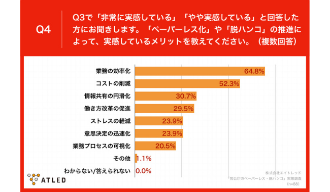Q3で「非常に実感している」「やや実感している」と回答した方に、「Q4.「ペーパーレス化」や「脱ハンコ」の推進によって、実感しているメリットを教えてください。」と質問したところ、「業務の効率化」が64.8%で最多となった。