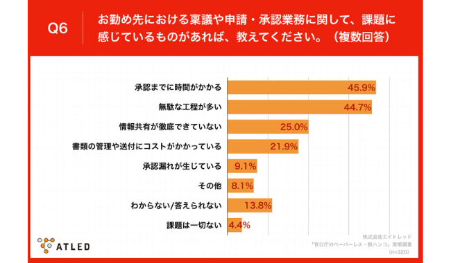 「Q6.お勤め先における稟議や申請・承認業務に関して、課題に感じているものがあれば、教えてください。」と質問したところ、「承認までに時間がかかる」が45.9%で最多となった。