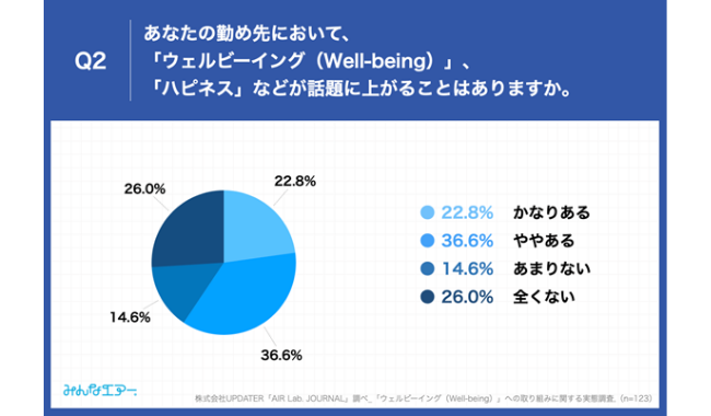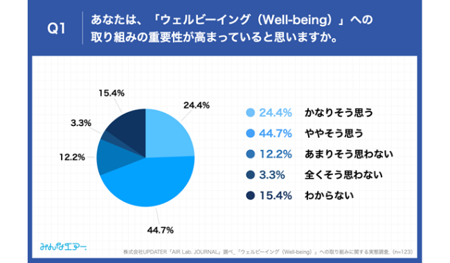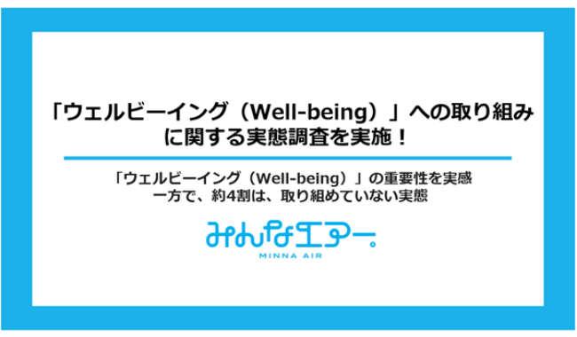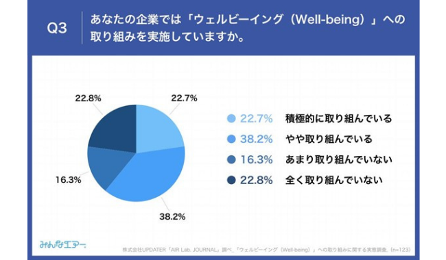 「顔の見えるライフスタイル」の実現を目指す株式会社UPDATER(所在地:東京都世田谷区、代表取締役:大石英司)の空気環境対策事業「みんなエアー」は、人事担当者123名を対象に、「ウェルビーイング」への取り組みに関する実態調査を実施した。