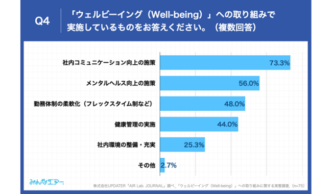 Q3で「積極的に取り組んでいる」「やや取り組んでいる」と回答した方に、「Q4.「ウェルビーイング」への取り組みで実施しているものをお答えください。(複数回答)」(n=75)と質問したところ、「社内コミュニケーション向上の施策」が73.3%で最多となった。