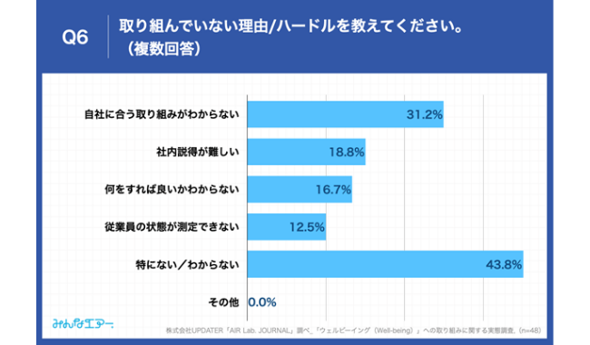 Q3で「あまり取り組んでいない」「全く取り組んでいない」と回答した方に、「Q6.取り組んでいない理由/ハードルを教えてください。(複数回答)」(n=48)と質問したところ、「自社に合う取り組みがわからない」が31.2%、「社内説得が難しい」が18.8%という回答となった。