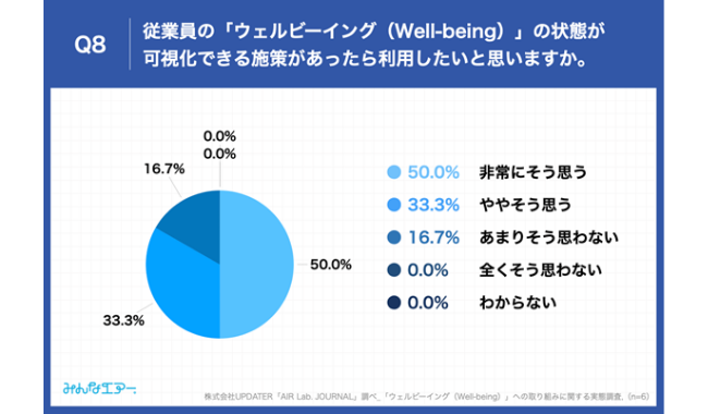 Q6で「従業員の状態が測定できない」と回答した方に、「Q8.従業員の「ウェルビーイング」の状態が可視化できる施策があったら利用したいと思いますか。」(n=6)と質問したところ、「非常にそう思う」が50.0%、「ややそう思う」が33.3%という回答となった。