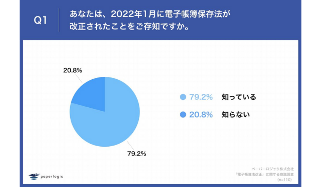 「Q1.あなたは、2022年1月に電子帳簿保存法が改正されたことをご存知ですか。」(n=110)と質問したところ、「知っている」が79.2%となった。