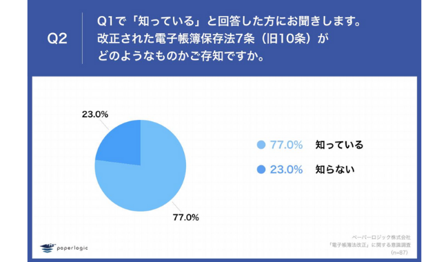 Q1で「知っている」と回答した方に、「Q2.改正された電子帳簿保存法7条(旧10条)がどのようなものかご存知ですか。」(n=87)と質問したところ、「知っている」が77.0%となった。