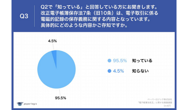 Q2で「知っている」と回答している方に、「Q3.改正電子帳簿保存法7条(旧10条)は、電子取引に係る電磁的記録の保存義務に関する内容となっています。具体的にどのような内容かご存知ですか。」(n=67)と質問したところ、「知っている」が95.5%となった。
