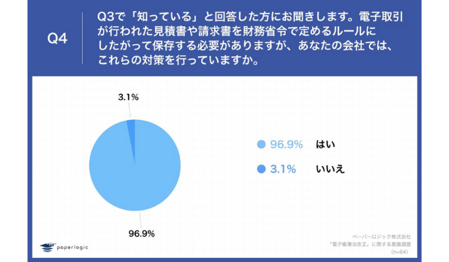 Q3で「知っている」と回答した方に、「Q4.電子取引が行われた見積書や請求書を財務省令で定めるルールにしたがって保存する必要がありますが、あなたの会社では、これらの対策を行っていますか。」(n=64)と質問したところ、「はい」が96.9%となった。