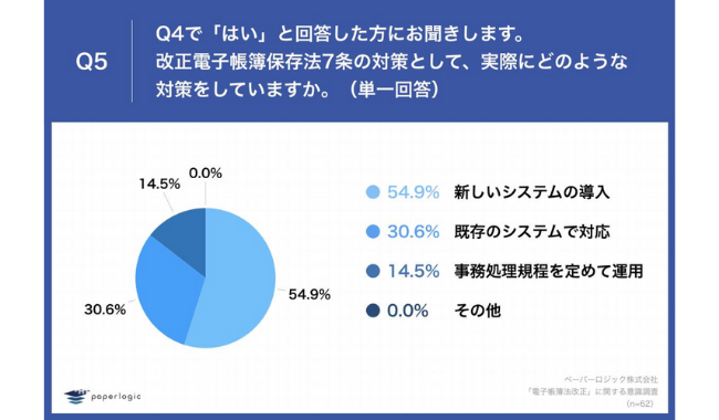 Q4で「はい」と回答した方に、「Q5.改正電子帳簿保存法7条の対策として、実際にどのような対策をしていますか。(単一回答)」(n=62)と質問したところ、「新しいシステムの導入」が54.9%、「既存のシステムで対応」が30.6%という回答となった。