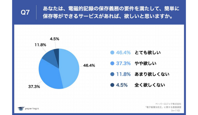 「Q7.あなたは、電磁的記録の保存義務の要件を満たして、簡単に保存等ができるサービスがあれば、欲しいと思いますか。」(n=110)と質問したところ、「とても欲しい」が46.4%、「やや欲しい」が37.3%という回答となった。