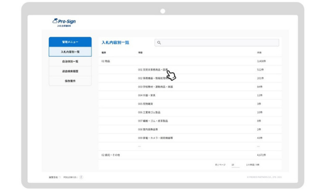 「Pro-Sign入札仕様書DB」は全国数百自治体の入札仕様書をクラウド上ですぐに検索することができる自治体専用サービスである。PFS(成果連動型民間委託:Pay For Success)によるコストコンサルティングサービス提供のために同社が収集・選定した仕様書について多くの自治体から閲覧の要望が寄せられたことから、各自治体のHPや入札システム等に掲載された入札情報・仕様書をこの度データベース化した。データベースは常に更新し、現在公表中の入札案件に関しても保存しているため、「新規事業検討の参考として類似事業を調べたい」「より良い仕様書を作成したい」などといった自治体職員の悩みを解決し、業務負担の軽減に貢献する。