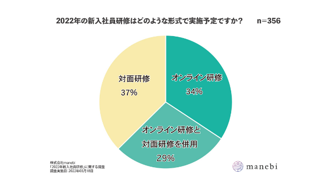 株式会社manebi(東京都千代田区 代表取締役執行役員CEO:田島 智也 以下、manebi)は、全国の2022年入社の新入社員研修に関わる人事・教育担当者356名に対し「2022年の新入社員研修」に関してのアンケート調査を実施した。