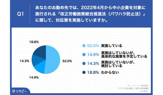「Q1.あなたのお勤め先では、2022年4月から中小企業を対象に施行される「改正労働施策総合推進法(パワハラ防止法)」に関して、対応策を実施していますか。」(n=308)と質問したところ、「実施している」が52.0%となった。