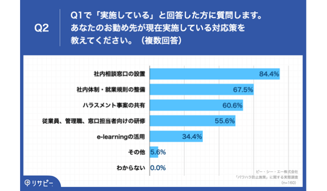 Q1で「実施している」と回答した方に、実施している対応策について質問したところ、「社内相談窓口の設置」が84.4%で最多となった。