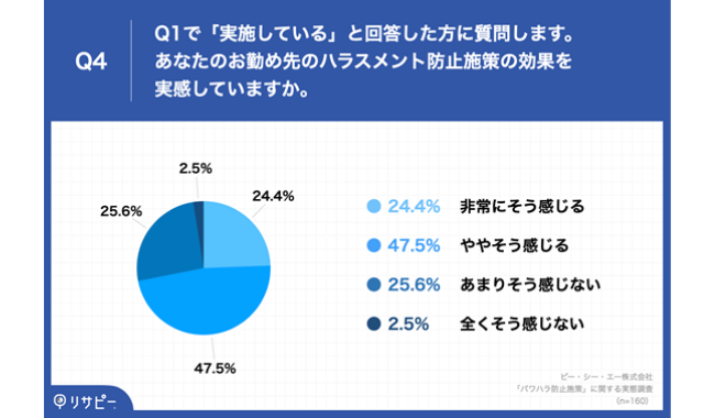 Q1で「実施している」と回答した方に、ハラスメント防止施策の効果を実感しているか尋ねたところ、「あまりそう感じない」が25.6%、「全くそう感じない」が2.5%となった。