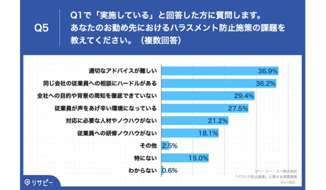 Q1で「実施している」と回答した方に、ハラスメント防止施策の課題について質問したところ、「適切なアドバイスが難しい」が36.9%、「同じ会社の従業員への相談にハードルがある」が36.2%となった。