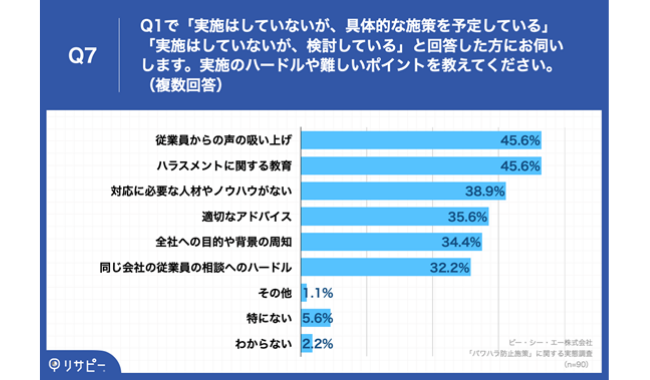 Q1で「実施はしていないが、具体的な施策を予定している」「実施はしていないが、検討している」と回答した方に、実施のハードルや難しいポイント尋ねたところ、「従業員からの声の吸い上げ」が45.6%、「ハラスメントに関する教育」が45.6%、「対応に必要な人材やノウハウがない」が38.9%という回答となった。