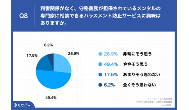「Q8.利害関係がなく、守秘義務が担保されているメンタルの専門家に相談できるハラスメント防止サービスに興味はありますか。」(n=308)と質問したところ、「非常にそう思う」が26.9%、「ややそう思う」が49.4%という回答となった。