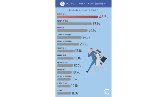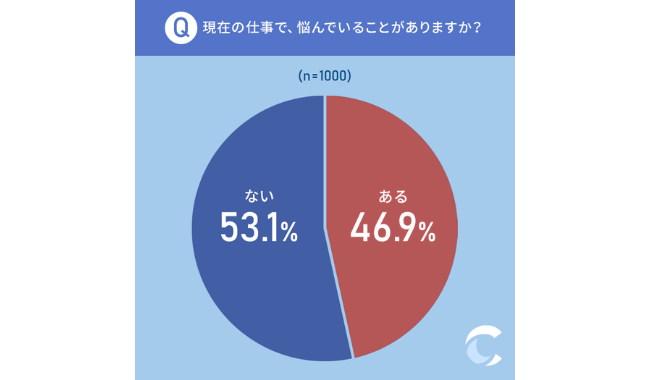 46.9%が「現在の仕事で悩んでいることがある」と回答した。どのようなことで悩んでいるかについても聞いたところ、46.5%が「給与が安い」と回答し、もっとも多い結果になった。次いで、「将来への不安」「仕事内容」で悩んでいる方が多いようだ。