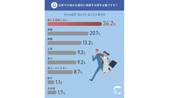 続いて、仕事での悩みを最初に相談する相手は誰かについて聞いたところ、36.2%が「誰にも相談しない」と回答し、もっとも多い結果になった。誰かに相談する方の中では、「家族」に相談する方が多いようだ。
