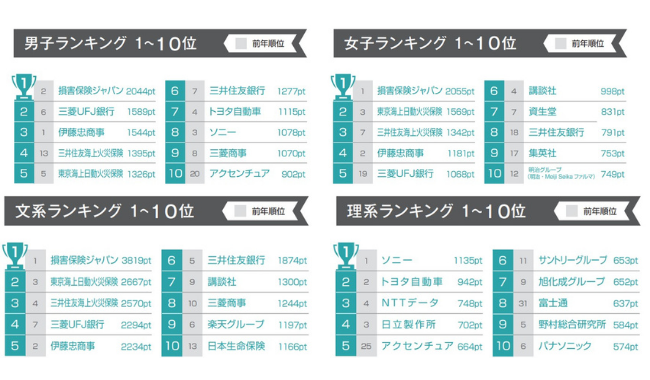 就職希望企業ランキング【国内就活生】損害保険ジャパンが2年連続人気No1