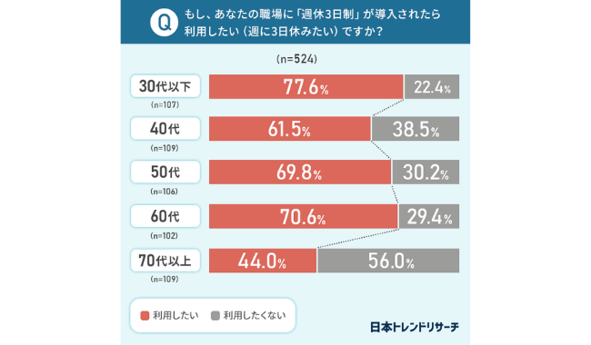 日本トレンドリサーチ(運営会社:株式会社NEXER)は、「週休3日制に関するアンケート」を実施し、結果をサイト内にて公開した。