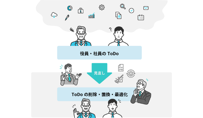 役員・社員、一人一人のToDoを最適に導き、今までにない時間の余裕を生む。全員がやるべき仕事に、より一層集中できるようになるまで左腕は働きかける。