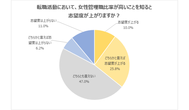 転職活動において、女性管理職比率が高いことを知ると「志望度が上がる」「どちらかと言えば志望度が上がる」と回答した20代は、35.8%となった。「性別に関係なく、働きやすい環境が整っていると感じる」「女性も活躍でき、かつ正当に評価されていると思える」といった声が寄せられた。