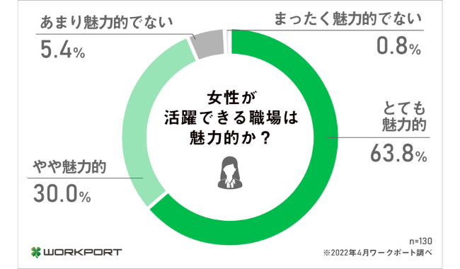 対象者全員に女性が活躍できる職場は魅力的か聞いたところ、「とても魅力的」が63.8%、「やや魅力的」が30.0%と、「魅力的だ」と回答した人が93.8%に上った。