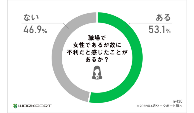 回答者全員に、現在の勤務先(離職中の人は直近の勤務先)で女性であるが故に不利だと感じたことがあるか聞いたところ、「不利だと感じたことがある」が半数以上の53.1%を占めた。
