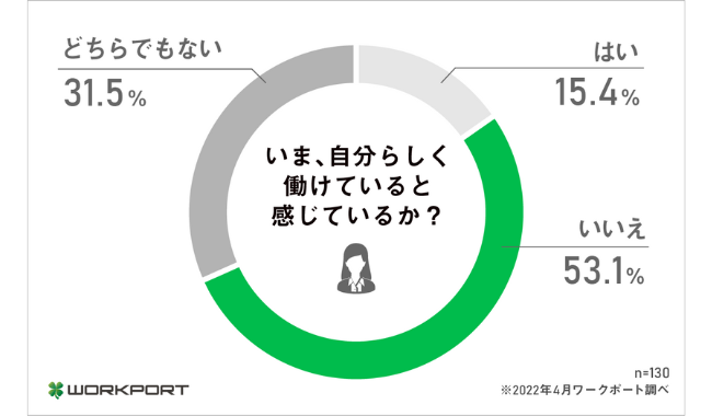 対象者全員にいま、自分らしく働けていると感じているか聞いたところ、「自分らしく働けている」人は、わずか15.4%で、半数を超える53.1%が「自分らしく働けていない」と回答した。