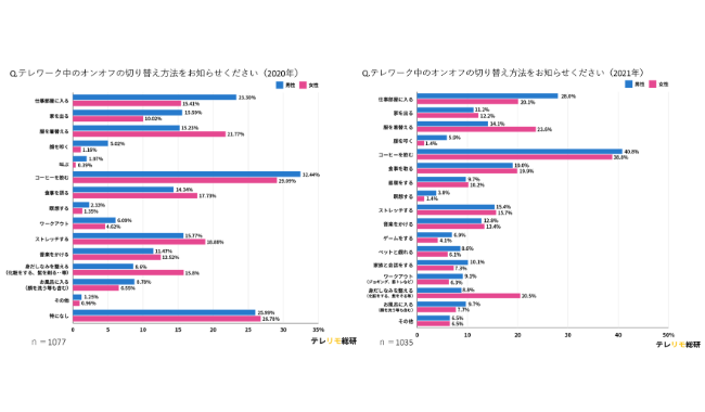 この原因のひとつとして、出社・退社の概念が薄いテレワークにおいては仕事のスイッチのオンオフを切り替えづらいということがあることが考えられる。逆に言えば、仕事のスイッチの切り替えがうまくできるようになれば、より効率よく、ストレスのないテレワークが実現できるということなのではないだろうか。そこで、仕事のオンオフの切り替え方について以前のデータと最新のデータを比較した。