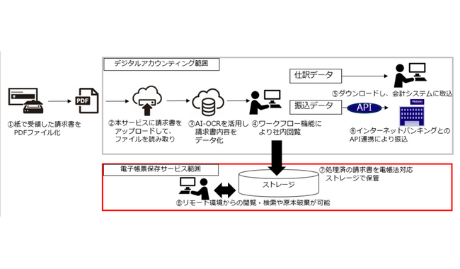 みずほデジタルアカウンティングのAI-OCRの機能でデータ化した請求書を、スキャナ保存要件や電子取引要件に準拠した形で電子保存ができるサービス。みずほデジタルアカウンティングと併せて利用することで一連の経理業務を効率化できる。
