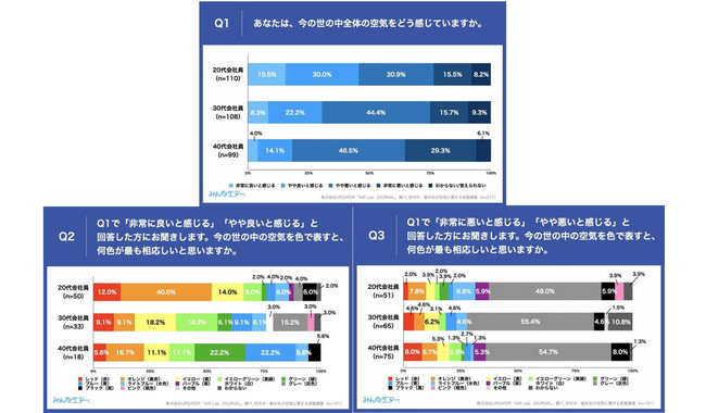 「顔の見えるライフスタイル」の実現を目指す株式会社UPDATER(所在地:東京都世田谷区、代表取締役:大石英司)のWell-being tech事業「みんなエアー」は、2022年8月30日(火)に開催する『みんなの働き方EXPO』でのセッションテーマの一つである「これからのみんなの幸せな働き方」に関する緊急調査として、20代会社員110名、30代会社員108名、40代会社員99名に、世の中・勤め先の空気に関する意識調査を実施した。