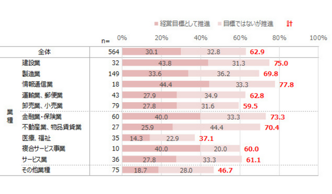 経理領域のDXを推進しているとの回答は全体で62.9%。業種では、情報通信業、建設業、金融業・保険業、などが推進しているとの回答の割合が多い。反対に医療・福祉では37.1%と推進割合が低い。