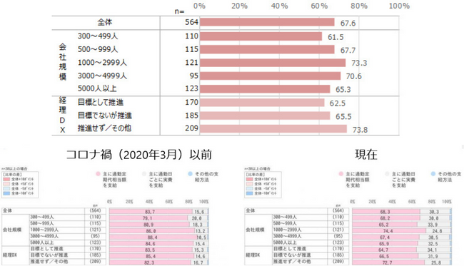 リモートワークが始まったことで、通勤定期代の支給は約15%減少。経理DXを推進していると答えた企業では更に減少している。