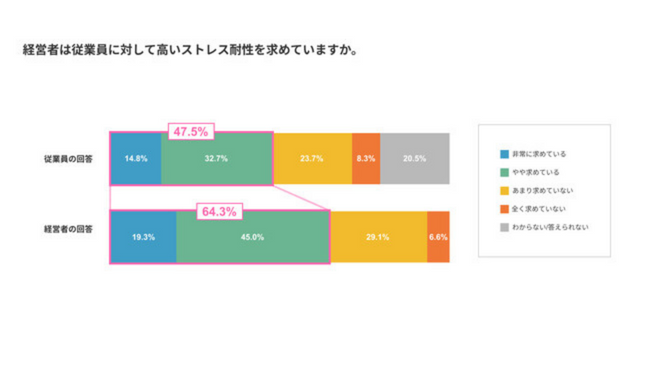 ■経営者は従業員に高いメンタル耐性を65.3%求めているのに対し、従業員は経営者から求められてると感じているのは47.5%と16.8Pのズレがある。