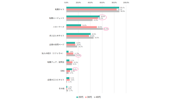 年代別に見てみると、20代・30代の「転職エージェント」の利用率が高く、40代は「ハローワーク」が61.0%と高い結果となっている。