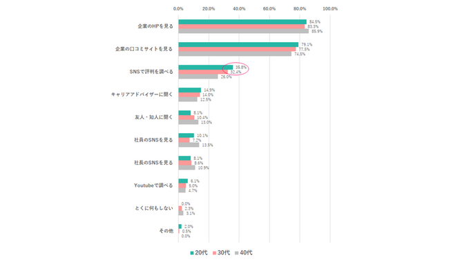 求人情報を見る以外に行う情報収集としては、1位「企業のHPを見る」84.5%、2位「企業の口コミサイトを見る」77.0%となっており、この2つは大多数の人が行っていることがわかった。