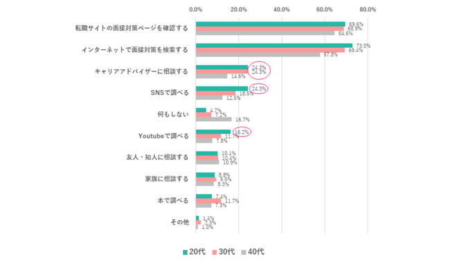 面接対策については、1位「転職サイトの面接対策ページを確認する」66.3%、2位「インターネットで面接対策を検索する」64.1%となっており、6割以上の人が行っていることがわかった。