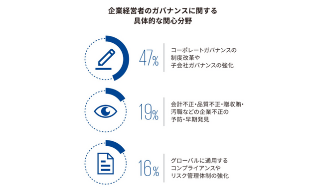 9割以上の経営陣が、ESGに関心がある一方で、企業不正の予防・早期発見やリスク・コンプライアンス管理体制の強化に関心があると回答した企業は相対的に少なかった。連結売上高が大きい企業ほど、経営陣はESGに関心があるとの回答割合が高い傾向がみられた。