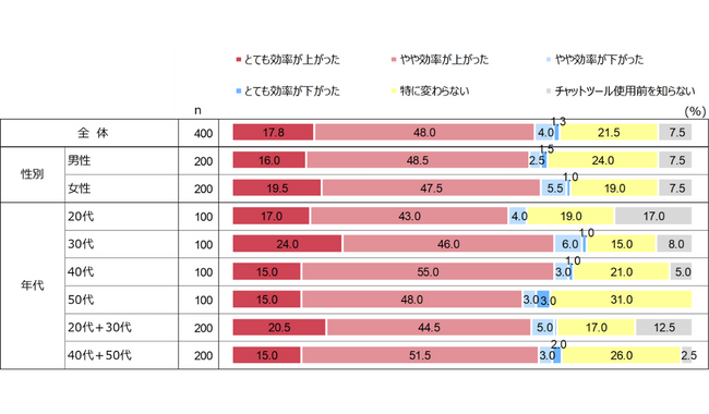 チャットツールを使用しているビジネスパーソンに尋ねたところ、導入により「業務効率が上がった」と考える層が全体の65.8%となった。なお、回答の傾向に大きな年代差は見られず、若年層からベテランまでその恩恵を感じていることがうかがわれる。
