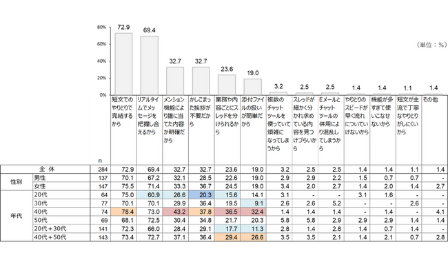 具体的にはどんな部分に利点を感じているのだろうか。「効率が上がった」と考える理由を問うと、「短文でのやりとりで完結するから」(72.9%)が最多となった。